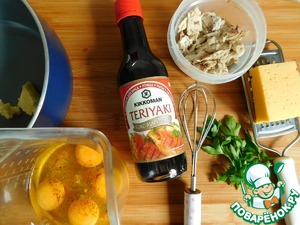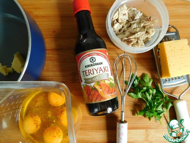 В отдельной ёмкости перемешиваем яйца, соль, перец, мускатный орех и Тэрияки. Яйца именно перемешиваем, а не взбиваем.