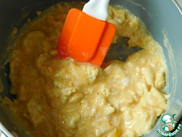 Выливаем яичную смесь в разогретый сотейник и, не уменьшая огонь, готовим яичницу, постоянно помешивая. Яйца будут схватываться комочками, крупные комочки разбиваем лопаточкой и снова перемешиваем. Готовим таким образом 2-3 минуты. Должна получиться комковатая яичная смесь, не слишком сухая, но уже и не текучая. -
