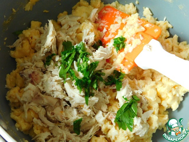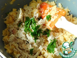 Выключаем огонь, добавляем к яичнице отварное куриное филе и мелко нарубленную петрушку. Всё перемешиваем и даём смеси немного остыть. В это время на сухой сковороде немного разогреваем тортилью по несколько секунд с каждой стороны.
