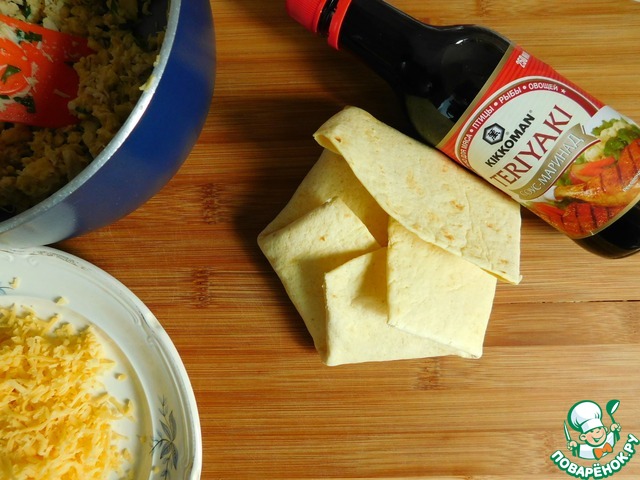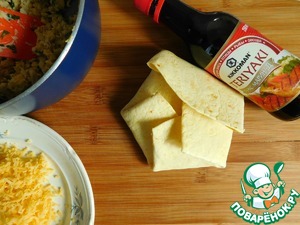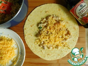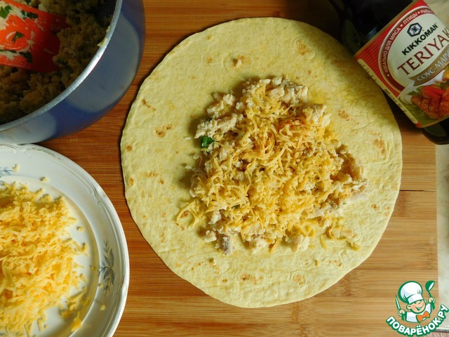 Пока тортилья тёплая, она гибкая, поэтому быстро собираем кесадилью. На лепёшку-тортилью выкладываем некоторое количество яичницы с курицей, щедро присыпаем тёртым сыром и добавляем несколько капель Тэрияки.