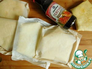 Далее каждую кесадилью я завернула в пергамент, свернув его, как конвертик. Можно убрать кесадильи просто по пакетам, но именно в пергаментном конвертике замороженные кесадильи мой муж берёт на работу и разогревает в микроволновке.
