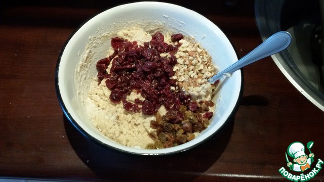 Я добавляю вяленую клюкву вместе с изюмом, на ваш вкус можно побольше или поменьше, чем в рецепте.