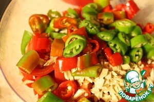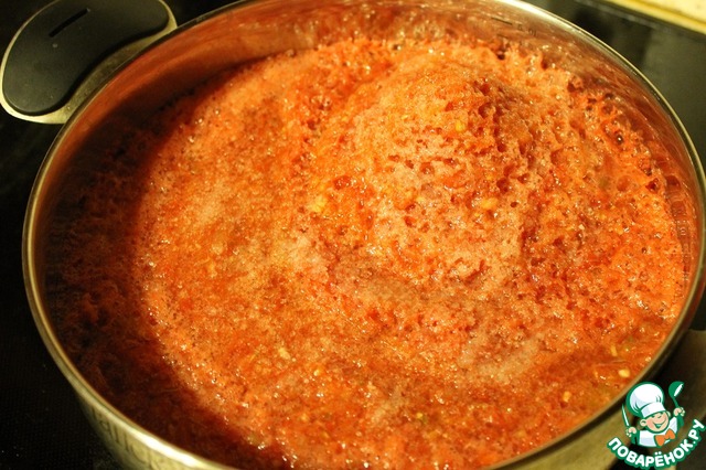 Измельчить все овощи с помощью мясорубки, посолить и поставить на огонь. Когда аджика закипит, снять пену и варить 10 минут.