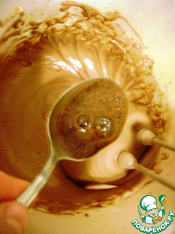 Погасить соду бальзамическим уксусом и быстро вылить в тесто. Хорошо перемешать. Смесь станет светлее и будет напоминать шоколадный крем.