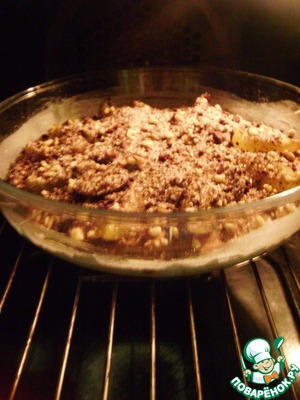 Засыпать пирог сверху остатками ореховой смеси и выпекать в разогретой до 200 градусов духовке 15 минут. За это время пирог хорошо поднимется. Затем нагрев уменьшить до 160 градусов и выпекать еще минут 5-7. Проверить на готовность- зубочистка в центре должна выходить чуть влажная. Очень важно не пересушить пирог!