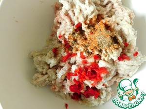 • Добавляем мелконарезанный перец чили, паприку и чёрный перец.