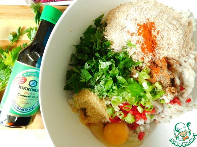 • Также в фарш добавляем панировочные сухари, коричневый сахар, яйцо, порубленную зелень.