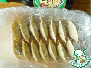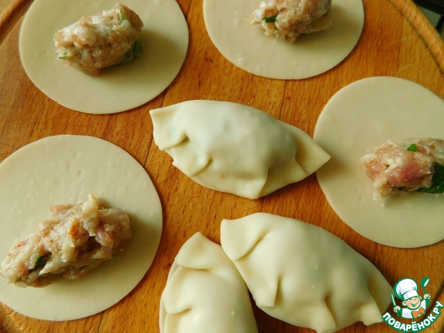 • Далее я поступаю следующим образом: после охлаждения, из части фарша я делаю пельмени на манер японских Гёдза.