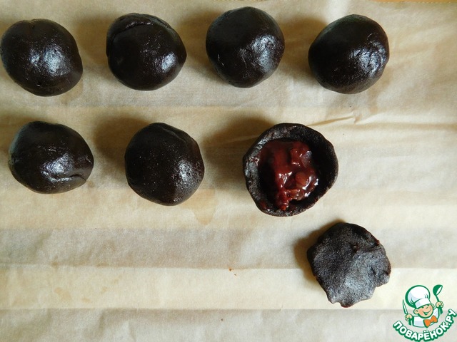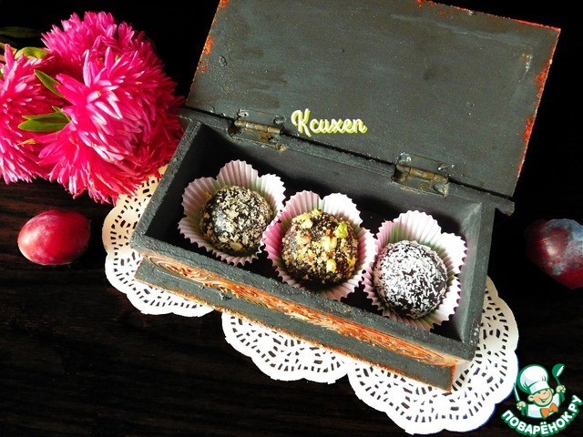 Можно взять любой понравившийся рецепт и начинить трюфельную массу остывшим сливово-шоколадным джемом. -