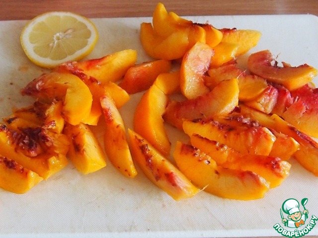 Персики очистить от шкурки, вынуть косточку и разрезать на дольки, полить их лимонным соком.