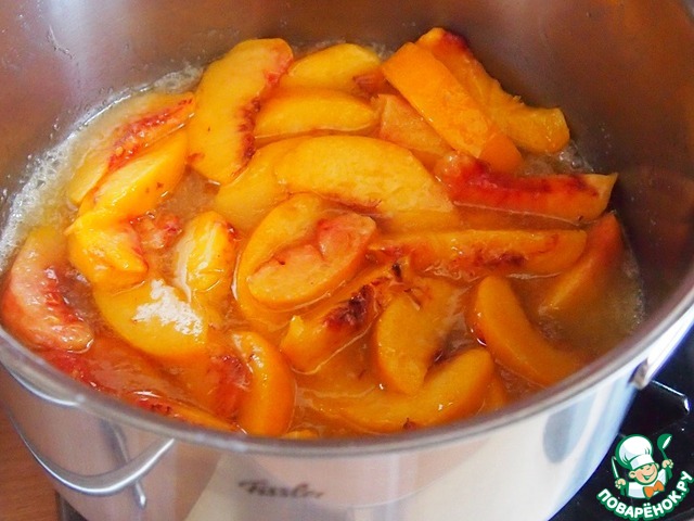 В кастрюле растопить масло с сахаром, можно использовать коричневый. Сложить в кастрюлю дольки персика и две минуты поварить, осторожно переворачивая их лопаткой.