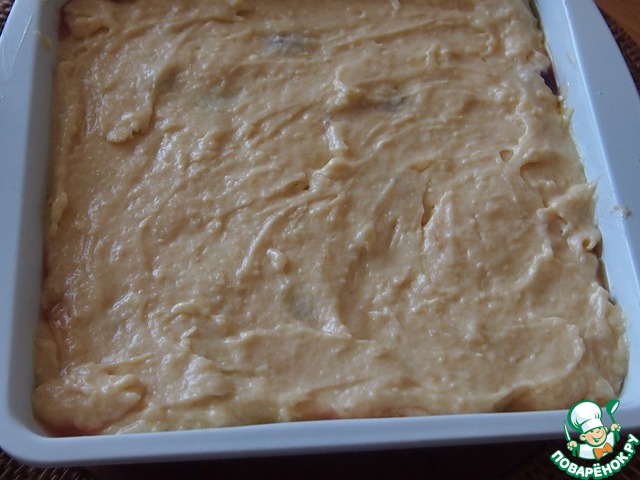 Ложкой, смоченной в холодной воде, разложить тесто по поверхности персиков с малиной, разровнять.