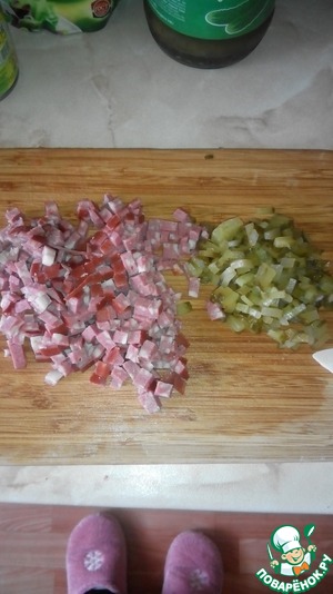 Колбасу и маринованные огурцы также режем мелким кубиком.