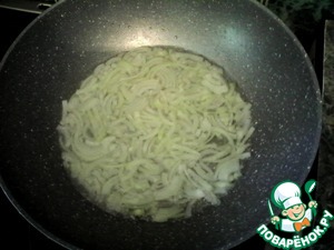 Тем временем чистим луковицу, нарезаем полукольцами, нагреваем сковороду, наливаем немного подсолнечного масла. Ставим огонь на максимум, постоянно помешивая, обжариваем лук 2-3 минуты.