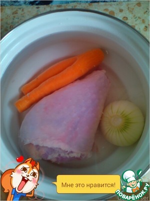 • Голень индейки, лук и морковь залить водой. Поставить на огонь. Как закипит, снять пенку, слегка посолить и варить до готовности (у меня ушло где- то часа 1,5).