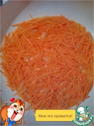 • Чеснок измельчить, обжарить 1 минуту на растительном масле, добавить морковь и слегка спассеровать.