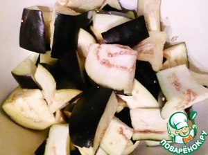 Нарезаем брусочками баклажаны. Посыпаем солью и перемешиваем.