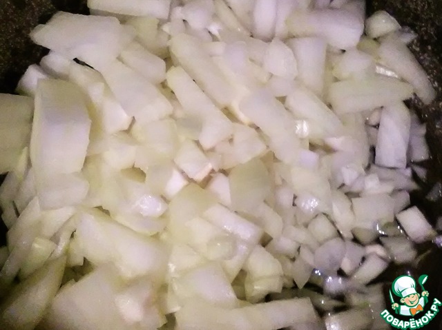 Теперь нам надо приготовить соус. Для этого, мелко нарезаем лук, и отправляем его в казан (толстостенную кастрюлю) с маслом тушиться. Тушим под крышкой на медленном огне.