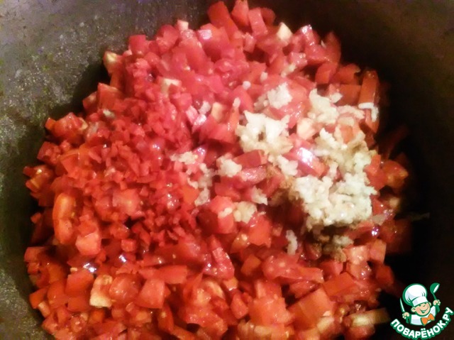 Когда лук размягчился и стал прозрачным, добавляем к нему помидоры, перец и выдавливаем чеснок. Постоянно помешиваем.