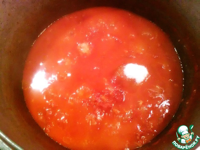 Не накрываем крышкой, так как нам нужно выпарить жидкость. У меня ушло 40 минут. Добавляем сахар и соль. Снова перемешиваем.