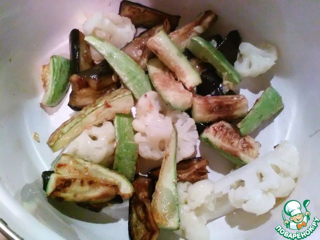 Выкладываем в глубокую посуду произвольно кабачок, баклажан и капусту.