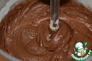В два-три приёма всыпать муку, просеянную с разрыхлителем. Тщательно перемешать тесто. (ложкой или миксером. Я всё делаю погружным блендером) Тесто получается достаточно густым.