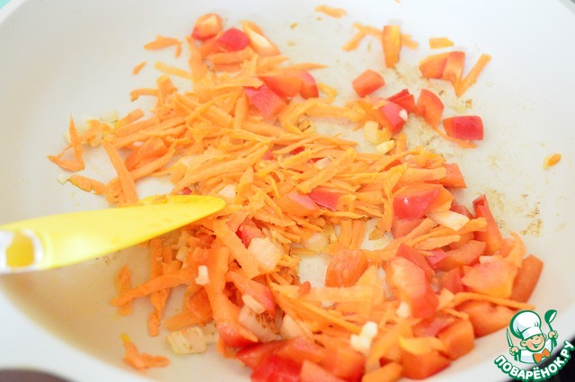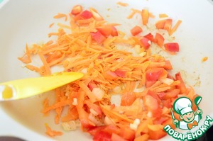 Лук обжарьте на растительном масле до золотистого цвета на среднем огне, добавьте чеснок, морковь и перец. Готовьте на слабом огне 5-7 мину, в конце добавьте укроп