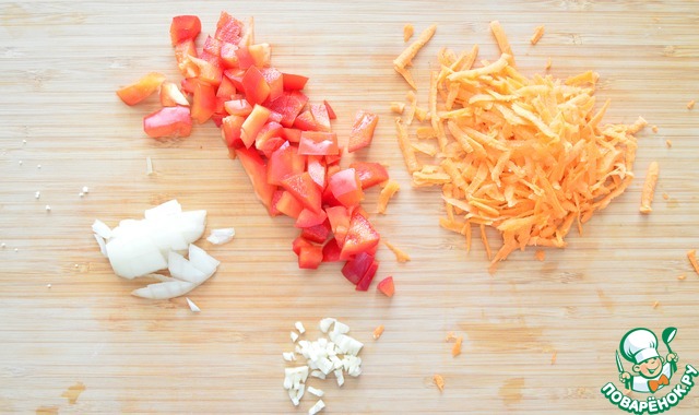 Нарежьте лук, морковь натрите на крупной тёрке, перец порежьте кубиками и измельчите чеснок.