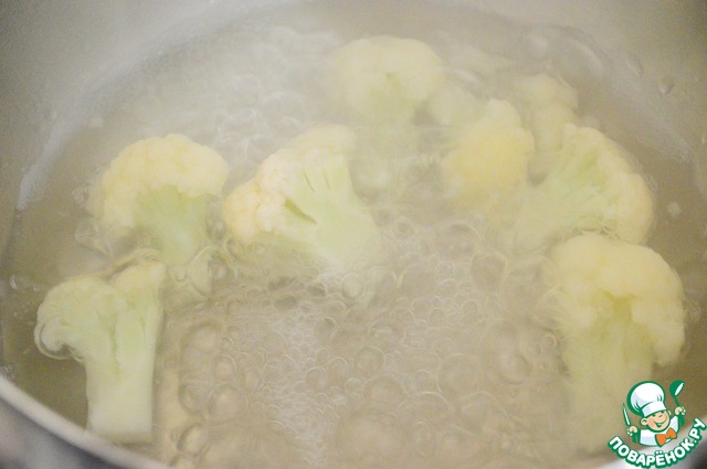 Цветную капусту промойте и отварите в подсоленной воде до полуготовности 5-6 минут. Слейте воду и остудите.