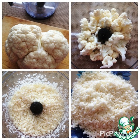 Я использовала средний по величине кочан цветной капусты. Делим на соцветия, укладываем в блендер и измельчаем до размера риса.