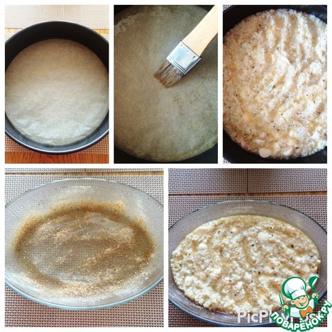В разъемную форму положила на дно пекарскую бумагу, смазала оливковым маслом и выложила половину начинки, разровняла. Стеклянную форму смазала оливковым маслом и обсыпала пекарскими сухарями, выложила остальную начинку.