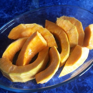 Тыкву чистим, нарезаем дольками, немного солим, сбрызгиваем оливковым маслом и ставим в разогретую духовку. Запекаем минут 15-20 (до мягкости). Нам понадобится не вся тыква, что на фото (это я сразу решила запечь побольше, чтобы потом использовать для других рецептов).