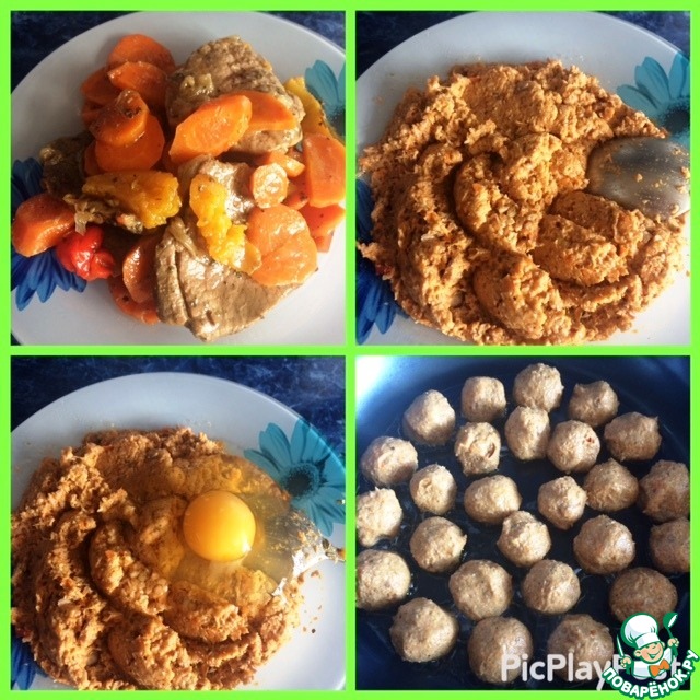 Запеченное мясо с овощами я измельчила в блендере, добавила яйцо, сформировала тефтельки и обжарила их на оливковом масле. Получились говяжье-овощные тефтели. Этот шаг можно опустить, приготовив тефтели по своему любимому рецепту.