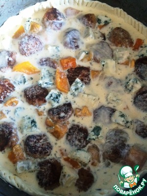 Слоеное бездрожжевое тесто (у меня готовое) немного раскатываем и заполняем им форму (у меня 26 см), формируя бортики. На дно формы укладываем наши тефтельки, между ними кусочки печеной тыквы и кусочки нарезанного сыра Дор блю. Подготовим заливку для киша: взболтать 2 яйца с 200 мл сливок, добавить щепотку соли, белого перца, тимьяна и мускатного ореха.