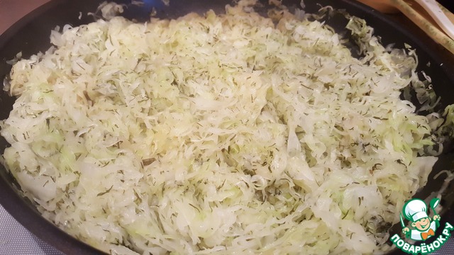 Замесить тесто. Я воспользовалась х/п. Пока тесто вымешивается и подходит, займёмся начинкой. Потушить мелко нашинкованную капусту (овощечисткой) до мягкости. Добавить укроп, посолить. Оставить остывать без крышки. Отварить яйца. Отварить филе грудки индейки с любимыми специями. Яйца мелко нарезать. Индейку провернуть с крупной сеткой через мясорубку. Нарезать зелёный лук.