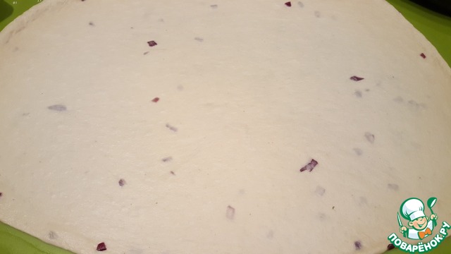 Раскатать одну часть по размеру формы для выпечки плюс бортик. Перенести тесто в форму. Обычно я пеку прямоугольные пироги, но в этот раз случился круглый пирог.