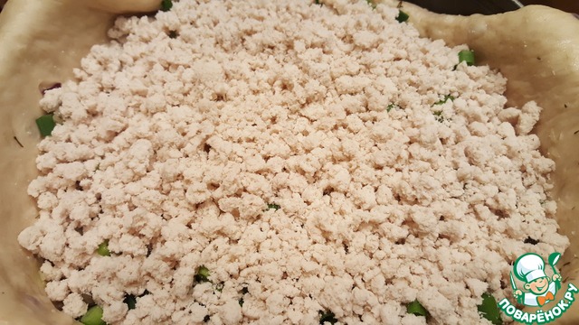 Выкладываем на тесто тушёную капусту. Сверху выкладываем нарезанное или пропущеннон через мясорубку отварное филе грудки индейки и нарезанный зелёный лук.