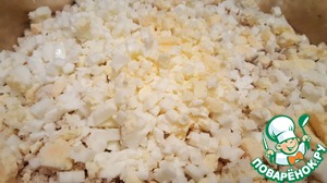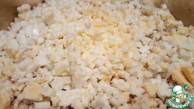 И завершаем начинку мелко нарезанными отварными яйцами.