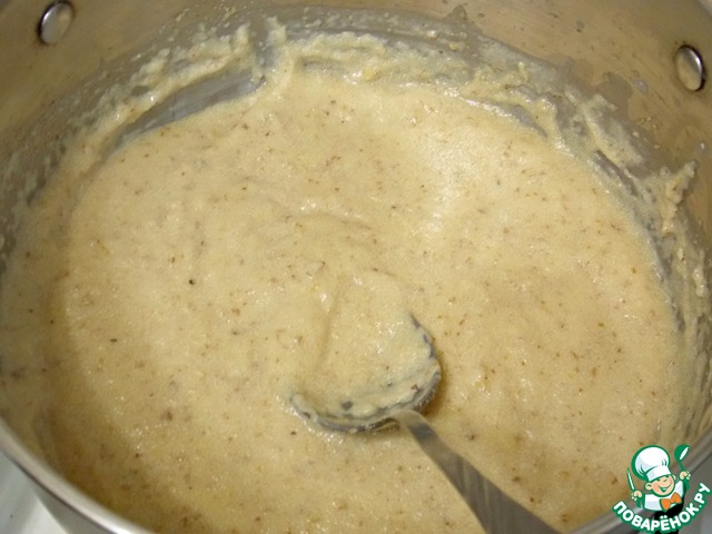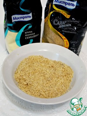 Орехи перемолоть, смешать с семолиной и сахаром "Демерара" фирмы "Мистраль".