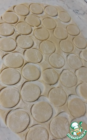 Раскатываем его скалкой толщеной примерно 5 мм. и стаканом или как я бокалом вырезаем кружки диаметр 5-6 см.