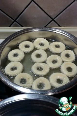 Когда масло разогрелось, забрасываем наши пончики-бублики в сковороду. И тут самый важный момент: когда сырой бублик через несколько секунд, после его заброски в масло, начнёт всплывать, его надо сразу перевернуть. При этом обе стороны его ещё белые, но этот приём даёт пончику равномерно раздуться.