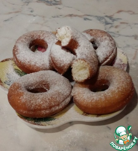 Готовые пончики-бублики выкладываем в тарелку и посыпаем сахарной пудрой.