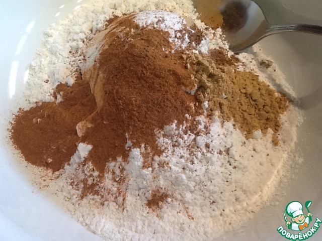 Сначала смешаем муку и специи, в общем все сухие ингредиенты. -