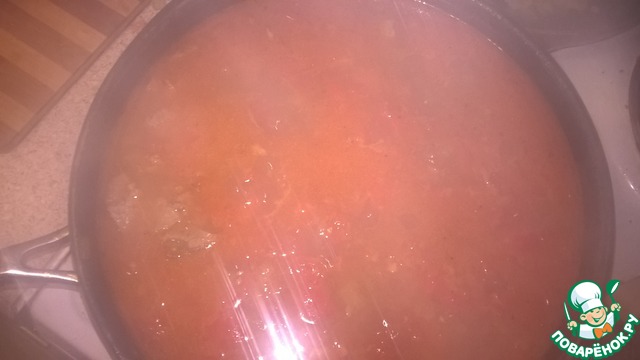 Добавляем 1 литр кипятка доводим до кипения и уменьшаем огонь до слабого и тушим минут 40, после добавляем красной фасоли 500г и снова доводим до кипения (если фасоль из банки, то после закипания можно добавить кинзы и снимаем с плиты, если нет, то тушим еще минут 40)