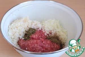 Соединить в миске фарш, измельченный репчатый лук, пряную сушеную зелень (0,5 ч. ложки), отварной и промытый рис, черный молотый перец и соль добавить по вкусу. Фарш хорошо вымешать.