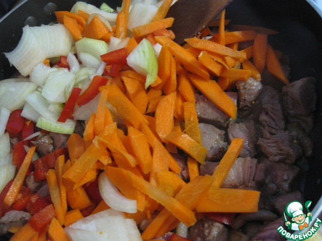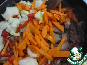Овощи нарезаем небольшой соломкой и добавляем к мясу, солим, перчим по вкусу