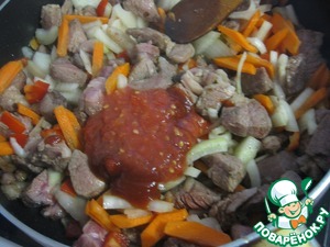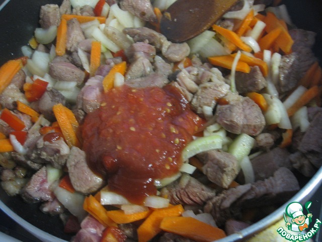 Затем добавляем нарезанное мясо, на слишком мелкие кусочки резать не нужно, примерно кубиками по 4 см, все же купеческое блюдо)), обжариваем его до легкой золотистости.