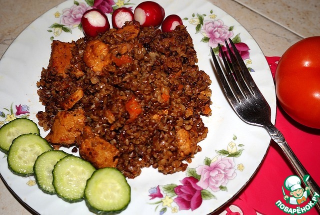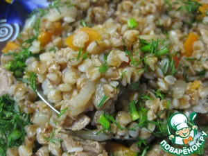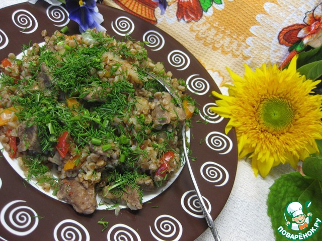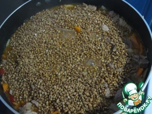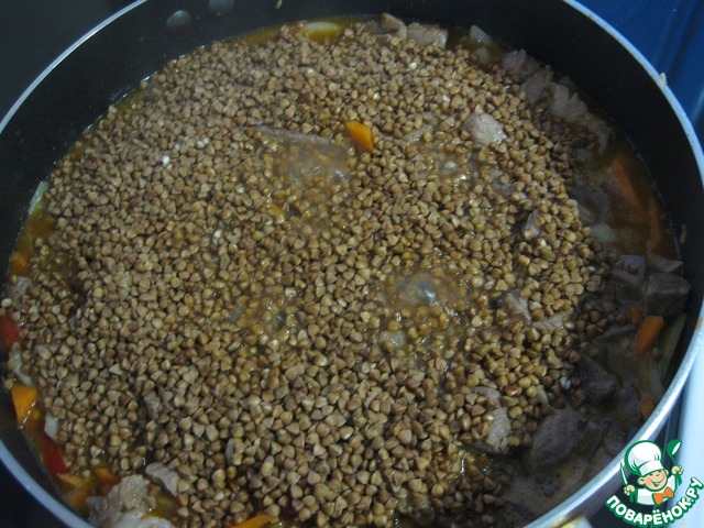 Наливаем немного воды и тушим под крышкой минут 5-10, затем засыпаем гречку, доливаем еще воды столько, чтобы примерно на палец закрыть гречку, и томим на среднем огне минут 20-25 (если у вас маленькая сковорода, то мясо с овощами нужно переложить в кастрюлю с толстым дном и там продолжить приготовление каши)