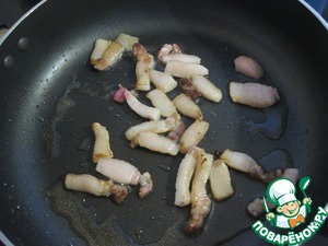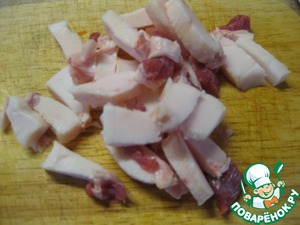 Отделяем от мяса сало, режем его на мелкие кусочки и обжариваем на раскаленной сковороде до золотистой корочки (если свинина постная, можно воспользоваться готовым жиром или маслом любым)