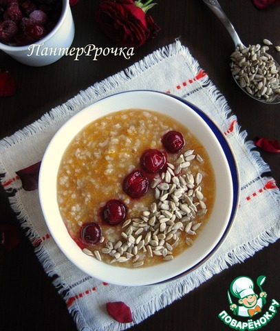 Варить до готовности еще минут 10. Готовую кашу разлить по тарелкам, добавить семечки и вишню без косточек.